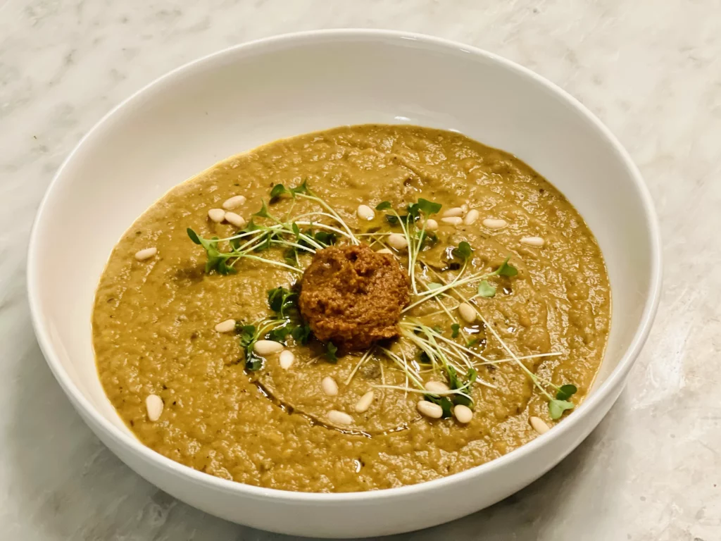 In batches, blend until smooth, return the pureed soup to the pot and add the coconut milk and lime juice. Gently heat the soup until just warm.